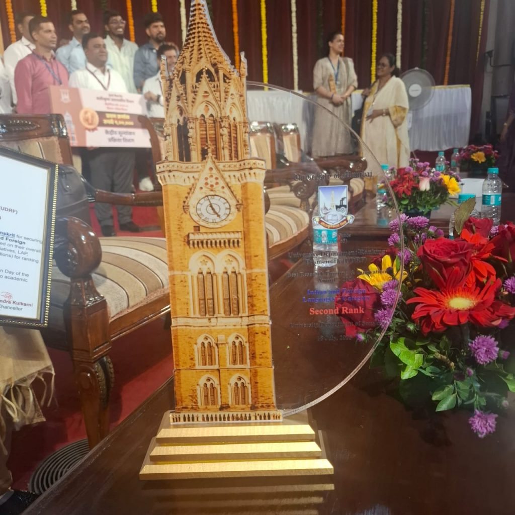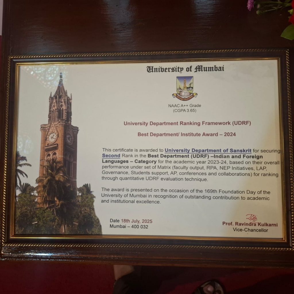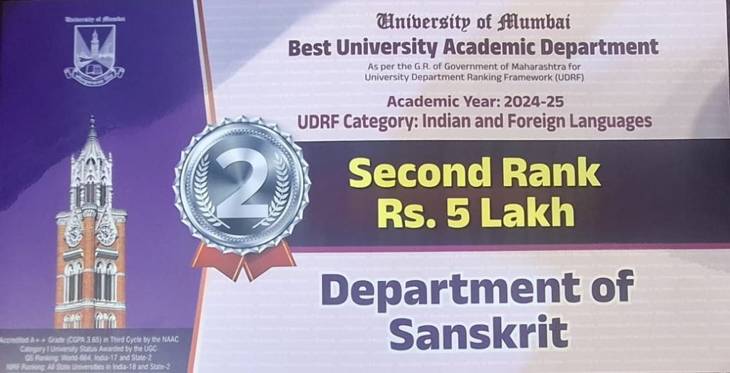 202603/17 A proud moment for the Department of Sanskrit, University of Mumbai! Awards/ achievements | Events | Sanskrit worldDr. Medha Deshpande We are awarded 2nd rank in the category of the Best Department – Indian and Foreign languages for the year 2023-24. Congratulations to all the teachers, non-teaching staff, visiting faculty, students, alumni and all our well wishers. Leave a ReplyYour email address will not be published. Required fields are marked *Comment * Name * Email * Website