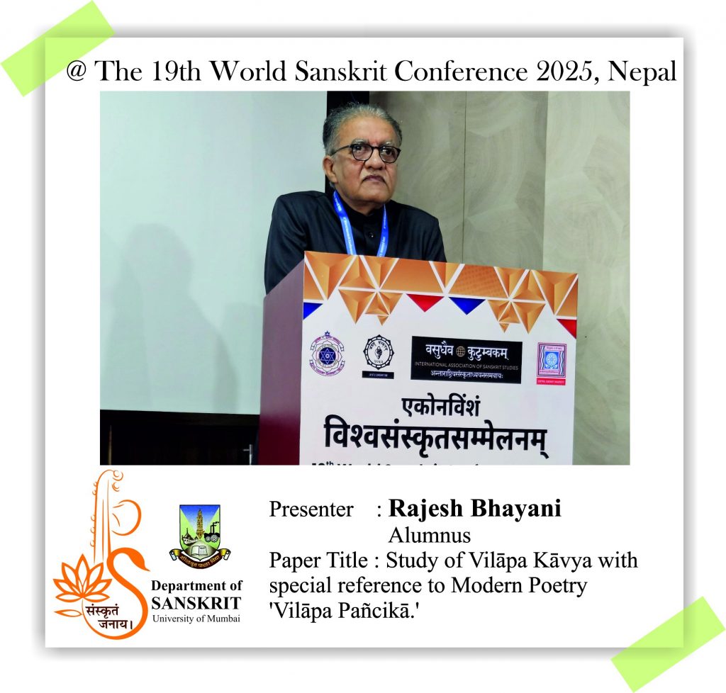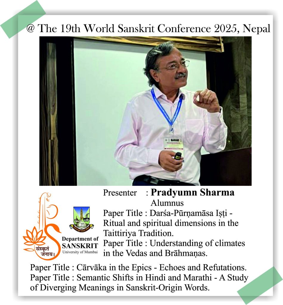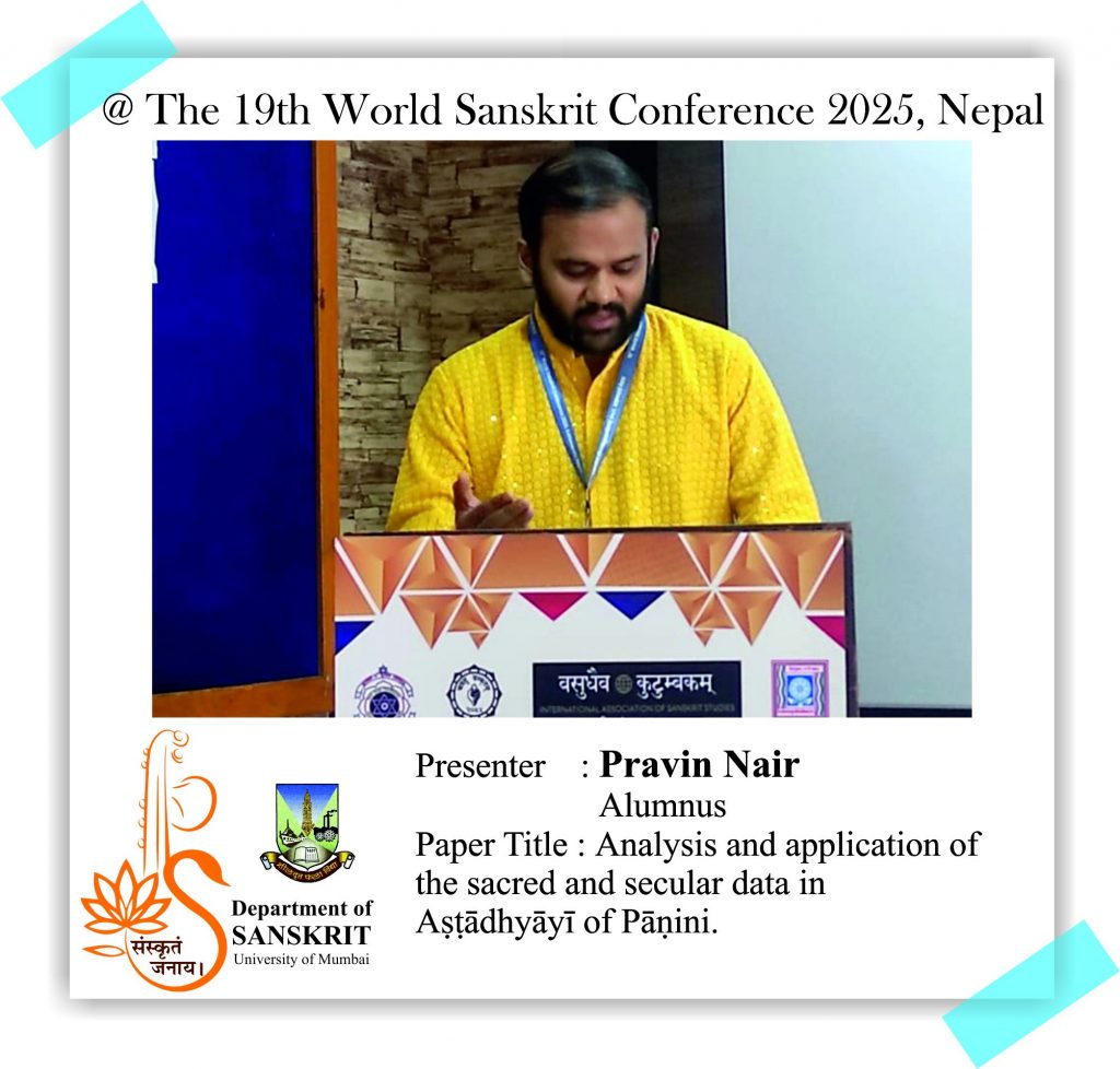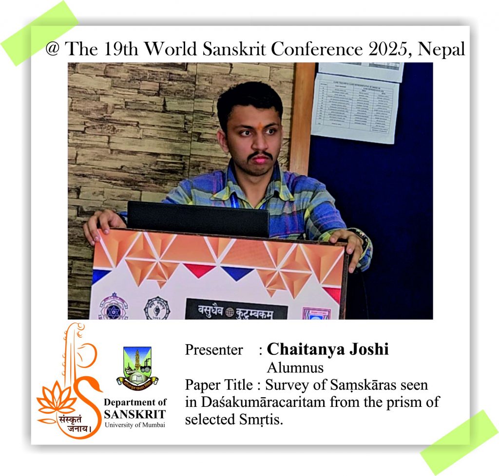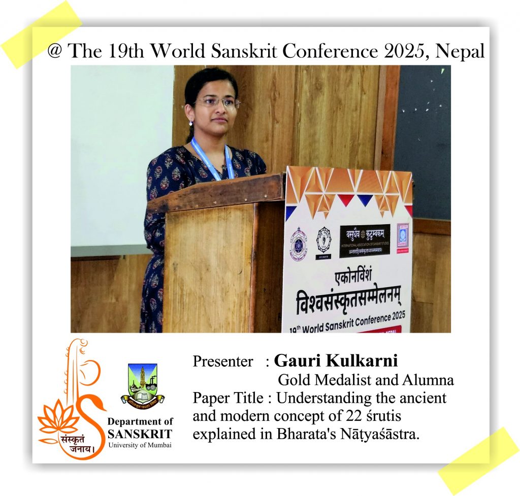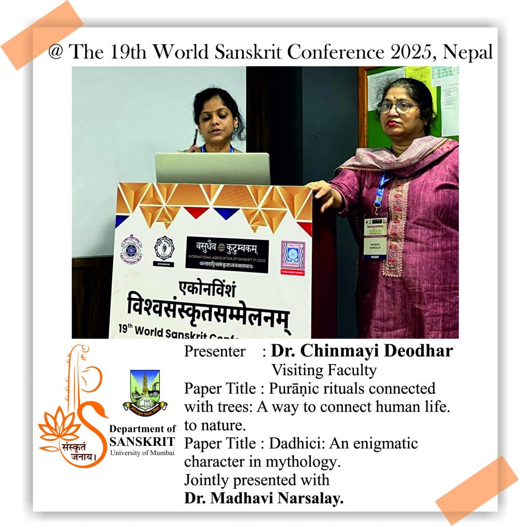 The Department of Sanskrit, University of Mumbai is proud of its alumni and students who presented their research papers at the 19th World Sanskrit Conference 2025, Nepal. Continuing the Sanskrit Department’s legacy of research, our former Head, Dr. Madhavi Narsalay, not just presented her research paper but also worked on two joint papers with our department faculty, Miss Renuka Panchal and Dr. Chinmayi Deodhar. Head and associate professor Dr. Suchitra Tajane was awarded by Best Research Paper Award. Her topic was Personality of Avantisundari in Kavyamimamsa.. Dr. Madhavi Narsalay, former head and associate professor of the department of Sanskrit, University of Mumbai, presented a paper titled ‘Dadhici – An Enigmatic character in mythology’ at the 19th World Sanskrit Conference 2025, Nepal .PhD holders and PhD scholars of the Department of Sanskrit, University of Mumbai, presented their research papers at the 19th World Sanskrit Conference 2025, Nepal.