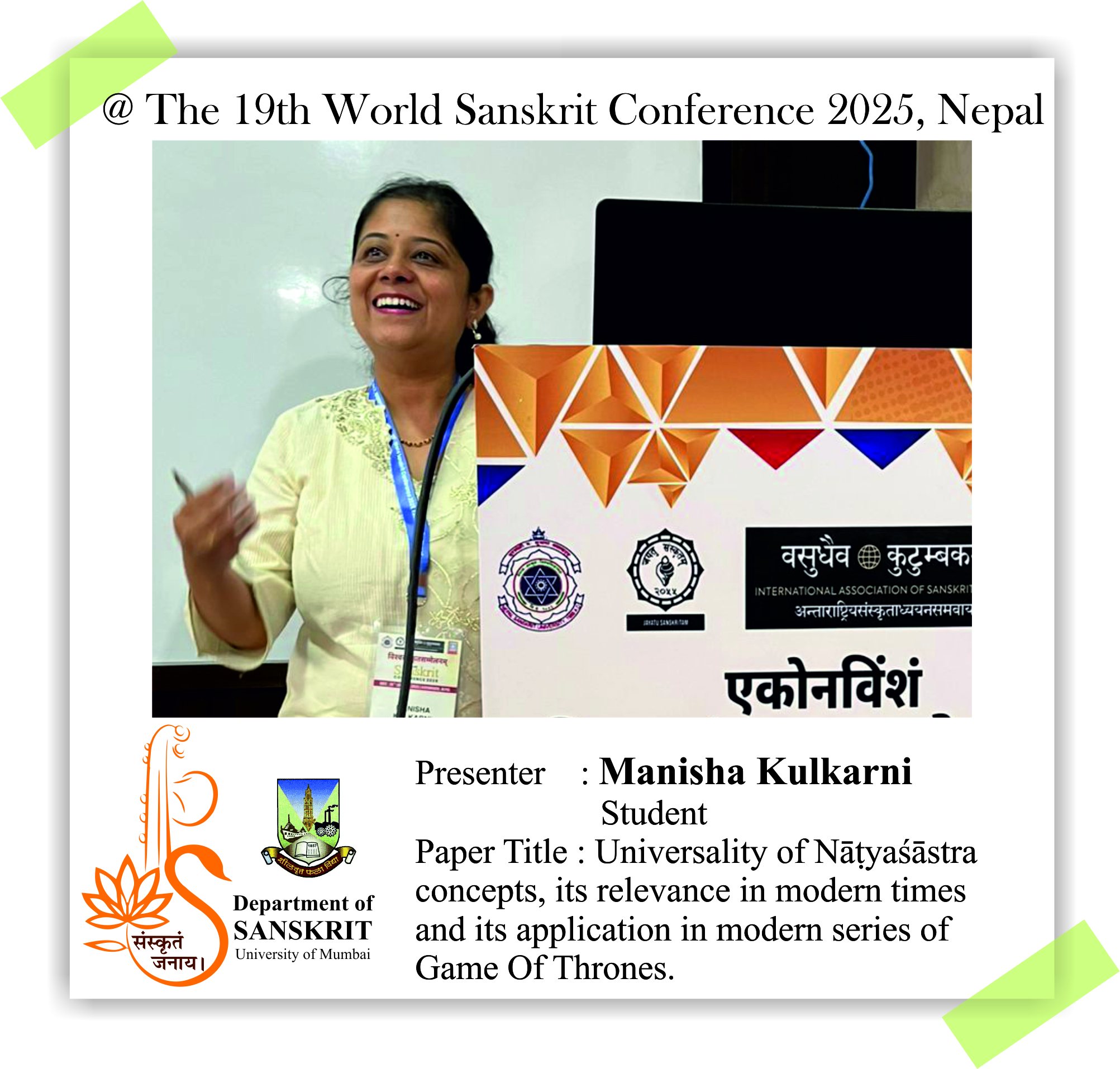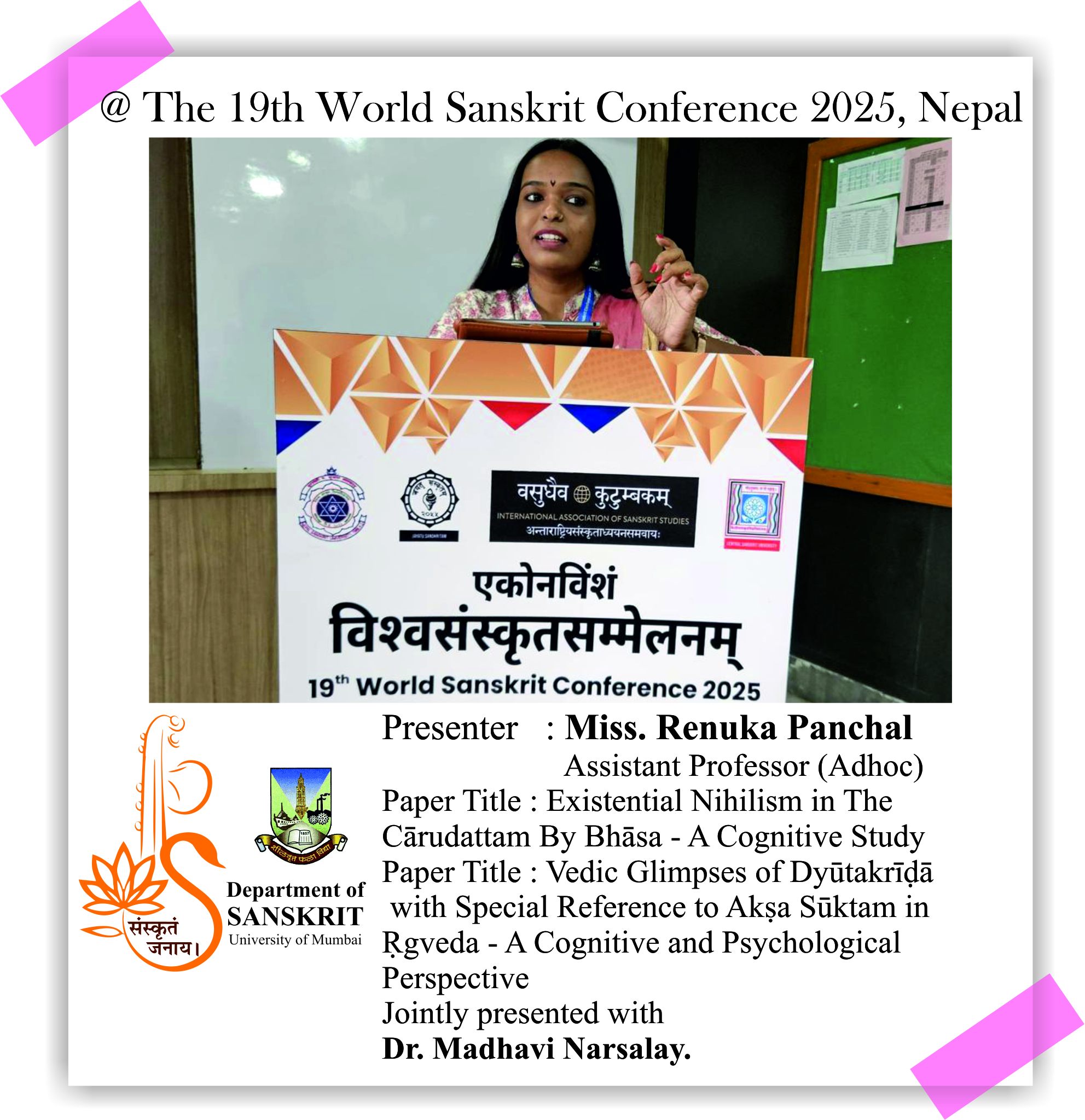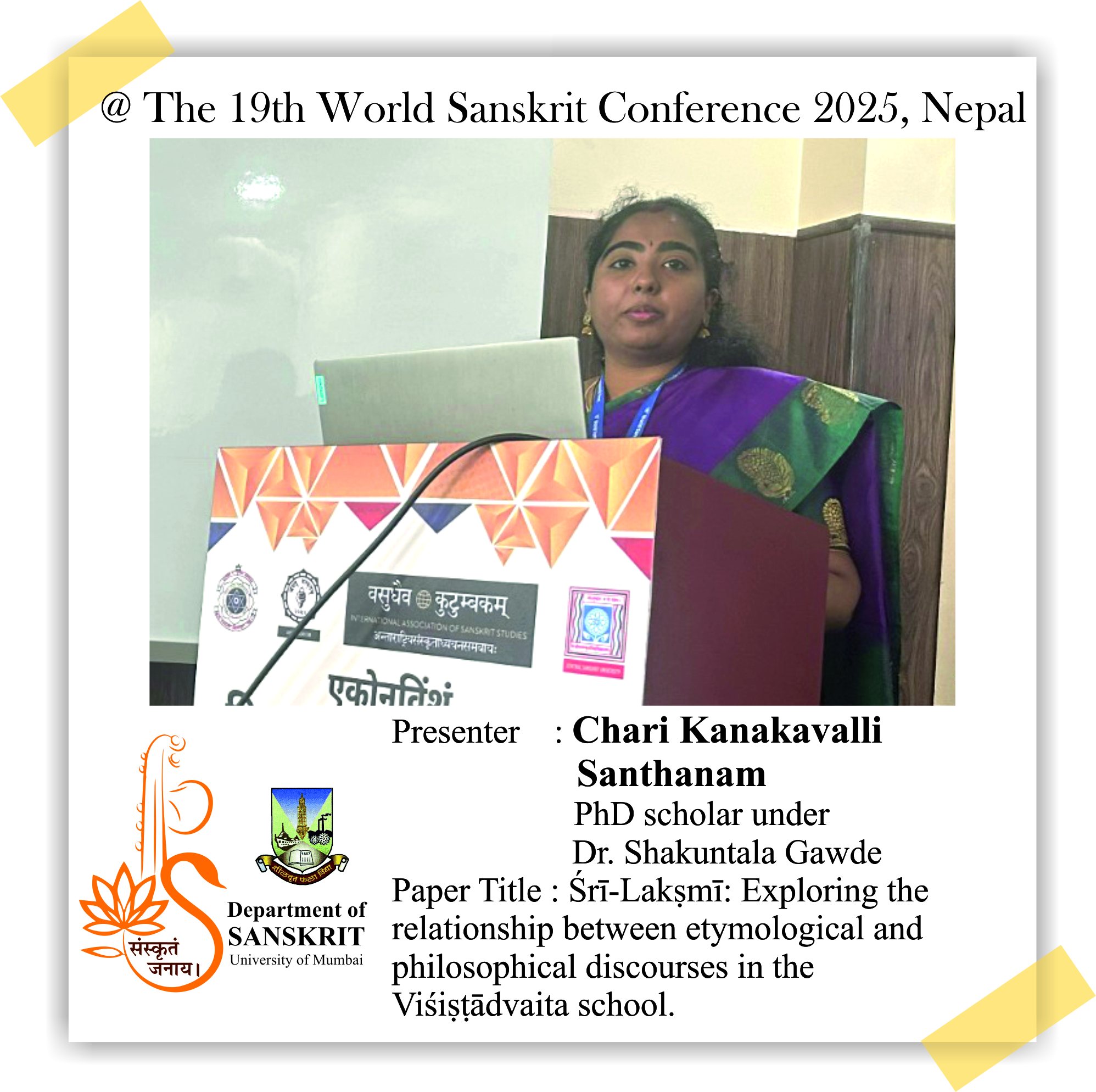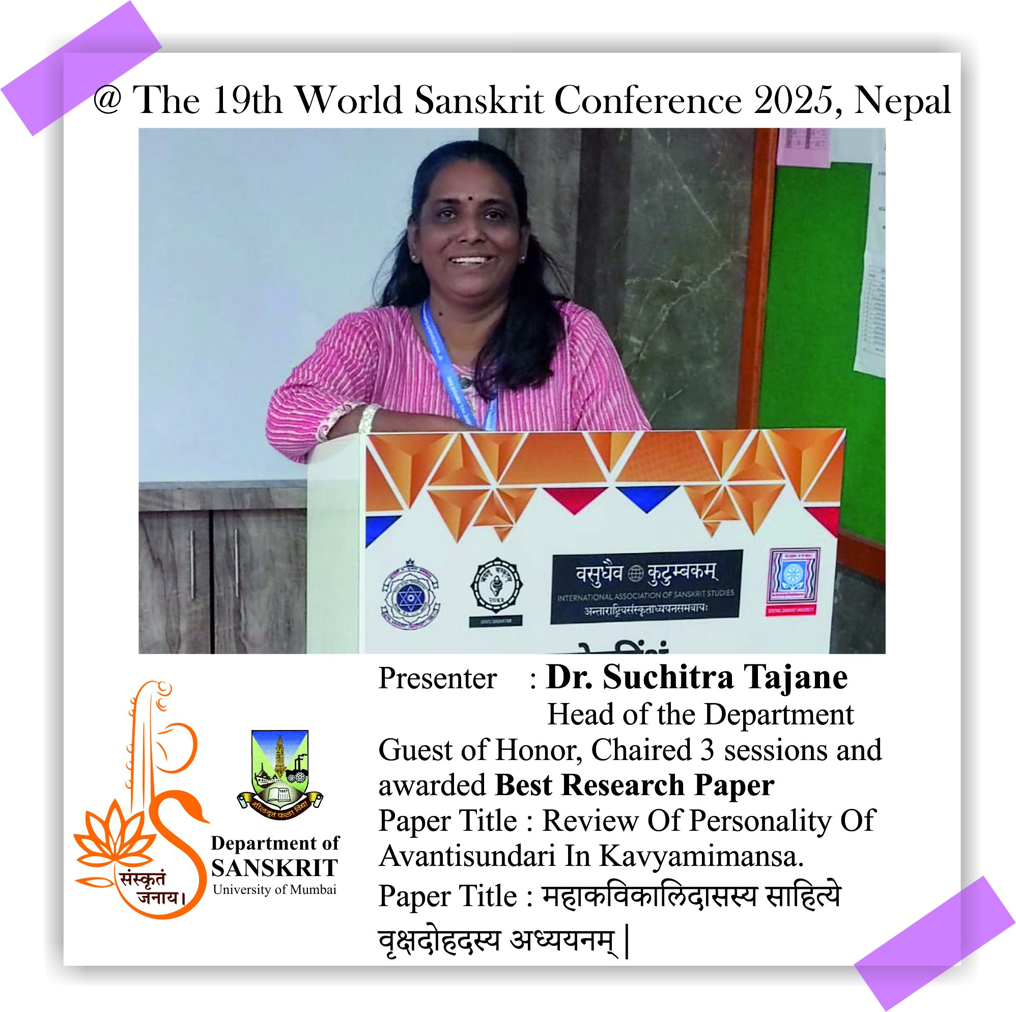The Department of Sanskrit, University of Mumbai is proud of its alumni and students who presented their research papers at the 19th World Sanskrit Conference 2025, Nepal. Continuing the Sanskrit Department’s legacy of research, our former Head, Dr. Madhavi Narsalay, not just presented her research paper but also worked on two joint papers with our department faculty, Miss Renuka Panchal and Dr. Chinmayi Deodhar. Head and associate professor Dr. Suchitra Tajane was awarded by Best Research Paper Award. Her topic was Personality of Avantisundari in Kavyamimamsa.. Dr. Madhavi Narsalay, former head and associate professor of the department of Sanskrit, University of Mumbai, presented a paper titled ‘Dadhici – An Enigmatic character in mythology’ at the 19th World Sanskrit Conference 2025, Nepal .PhD holders and PhD scholars of the Department of Sanskrit, University of Mumbai, presented their research papers at the 19th World Sanskrit Conference 2025, Nepal.